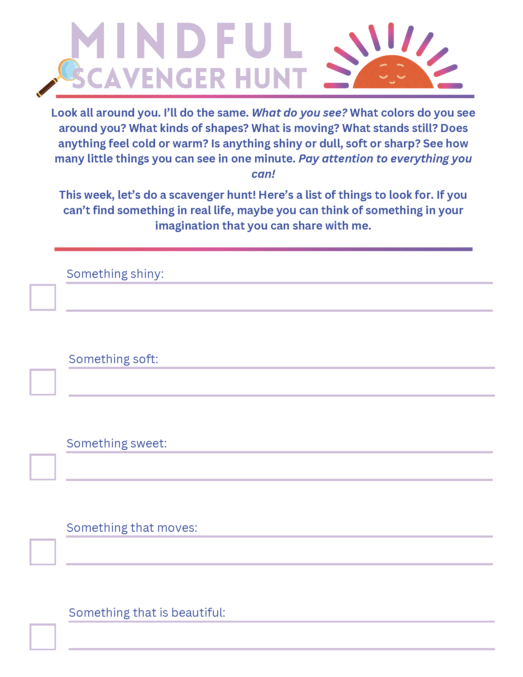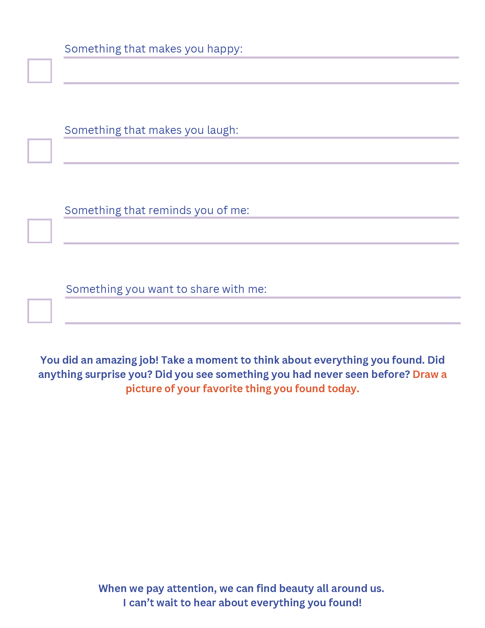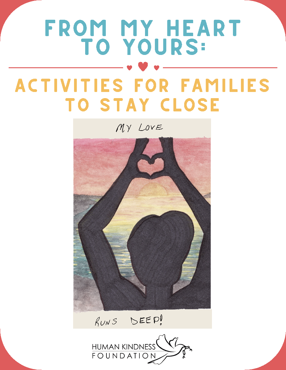 From My Heart to Yours: Activities For Families to Stay Close is a series of creative mindfulness activities for parents experiencing incarceration and their children. These activities are a resource for families to stay connected and even get to know each other better during incarceration. They can be completed separately and shared by mail or serve as conversation prompts for phone, video, or in-person visits. Each activity includes a brief mindfulness exercise, questions, and opportunities for creative reflection.